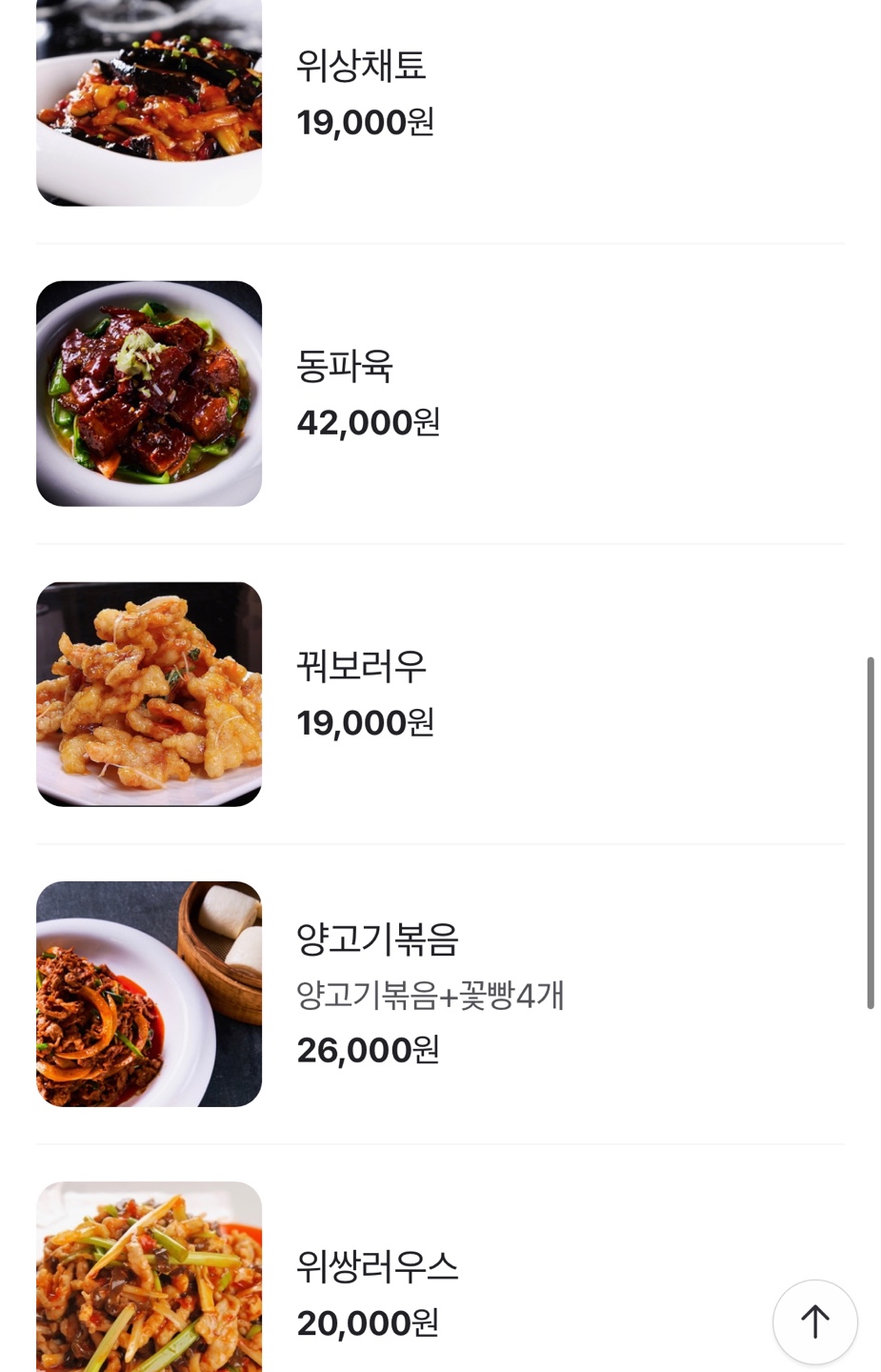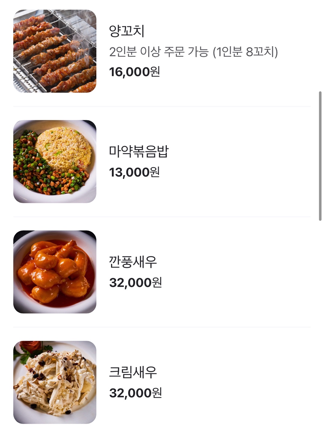 저희 가족이 미가에서 훠궈, 양꼬치, 위상채툐(가지튀김), 꿔바로우, 짜장면, 소고기 마라 볶음면, 깐풍새우, 볶음밥 등을 먹어봤어요.