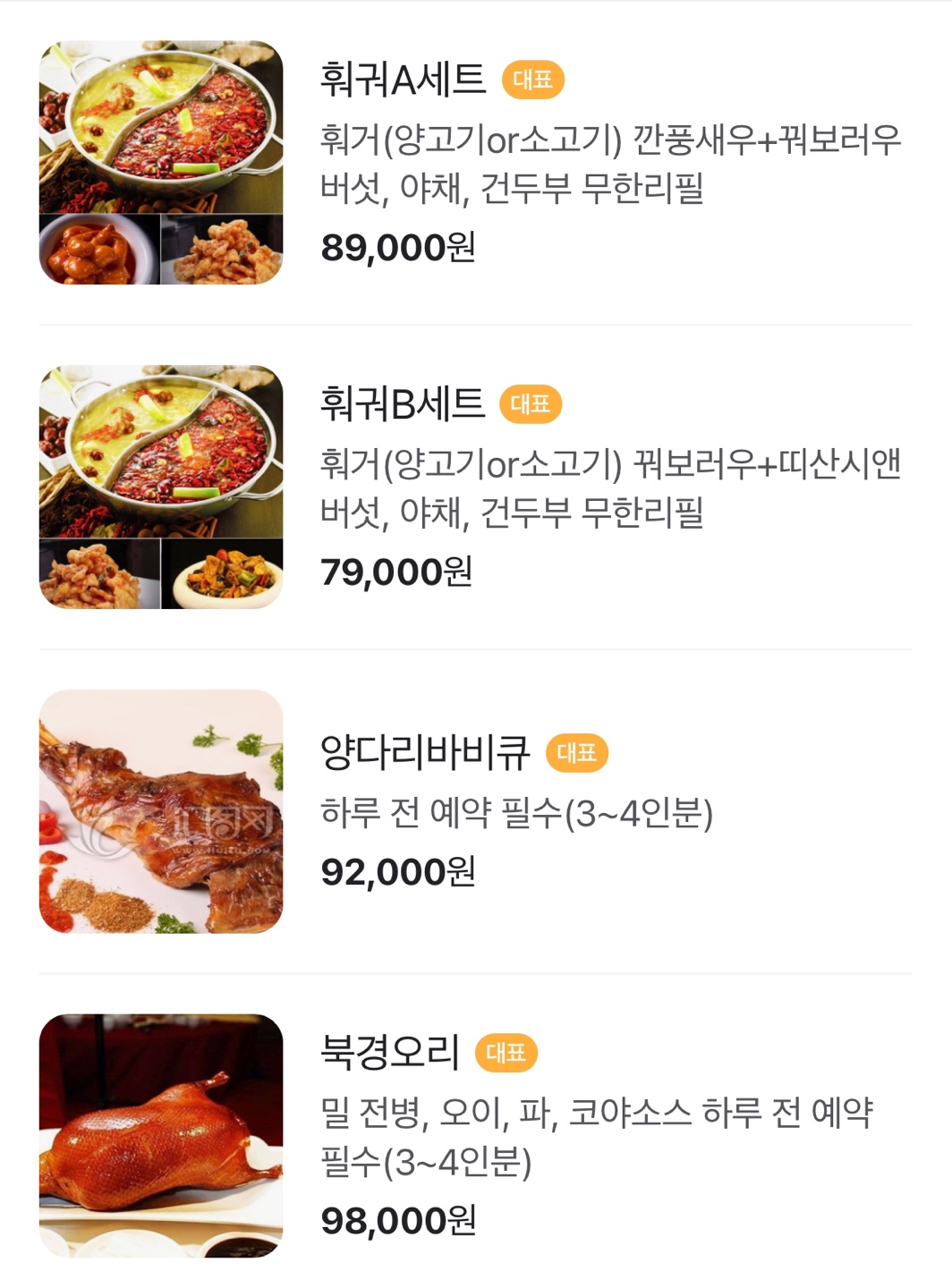 다른 양고기 메뉴: 훠궈A세트(89,000원), 훠궈B세트(79,000원), 양다리바비큐(92,000원), 양꼬치(16,000원)