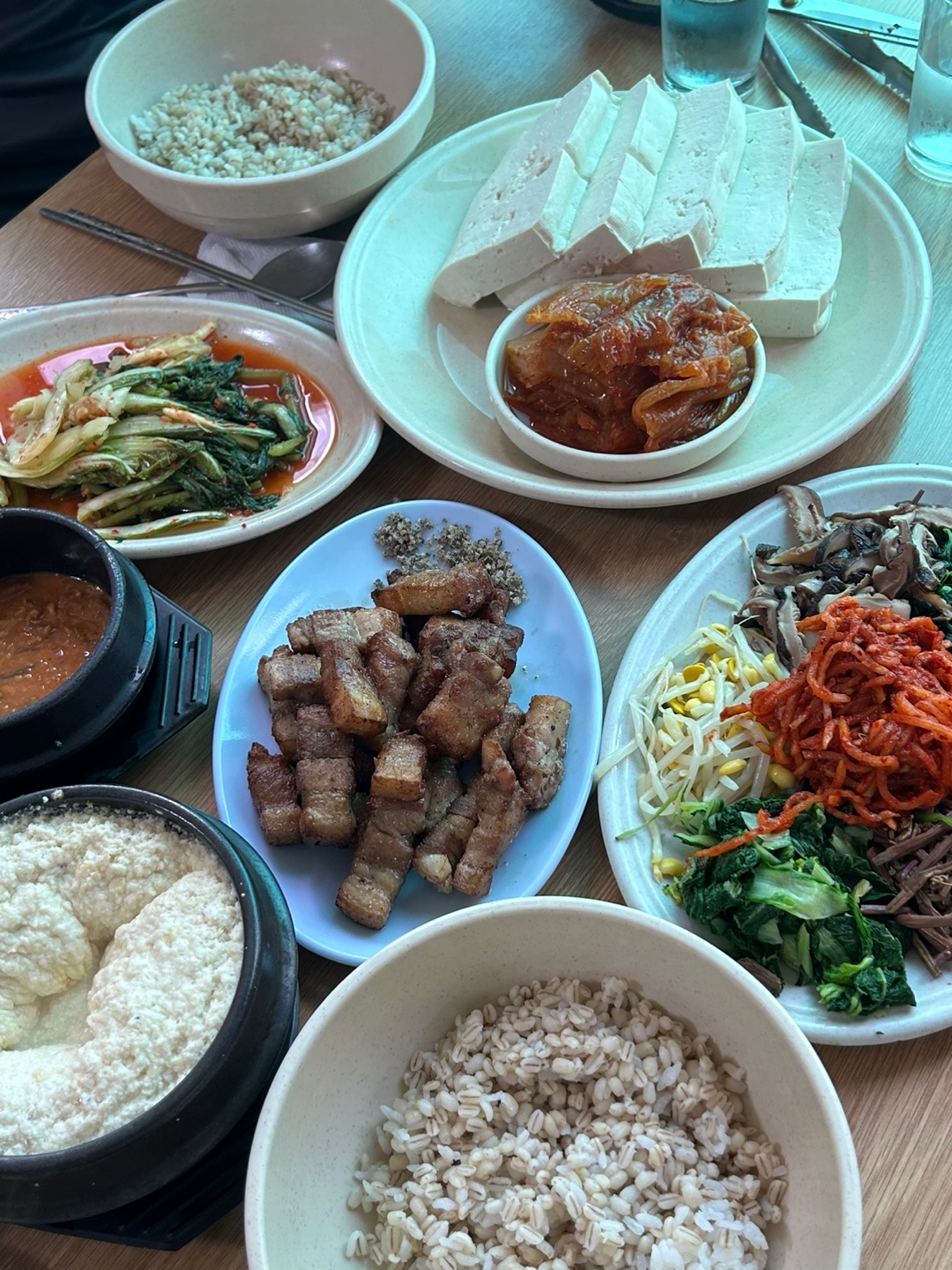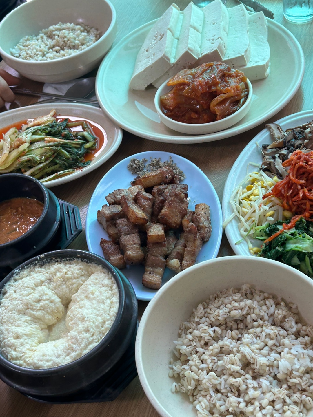 저희는 두 그릇이라 하나는 강된장, 하나는 고추장 넣고 비볐어요. 여기는 참기름이 아니고 들기름을 주더라고요. 저야 들기름을 워낙 좋아하니 나중엔 두부 위에도 들기름을 뿌려먹었어요!