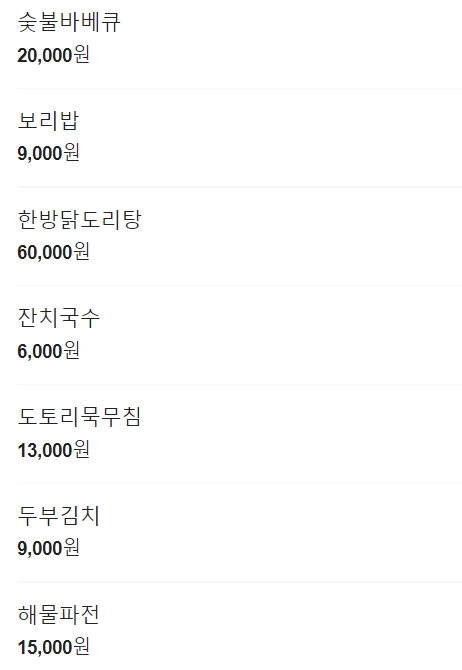 백운 농장의 메뉴는 이렇게 되어 있어요. 산 아래 있는 밥집이다 보니 백숙이 베스트 메뉴일 것 같았지만, 야외 캠핑장에서 구워먹는 듯한 느낌의 바베큐가 더 인기라고 해요! 밖에서 쉴 새 없이 고기를 굽는 냄새가 나요.