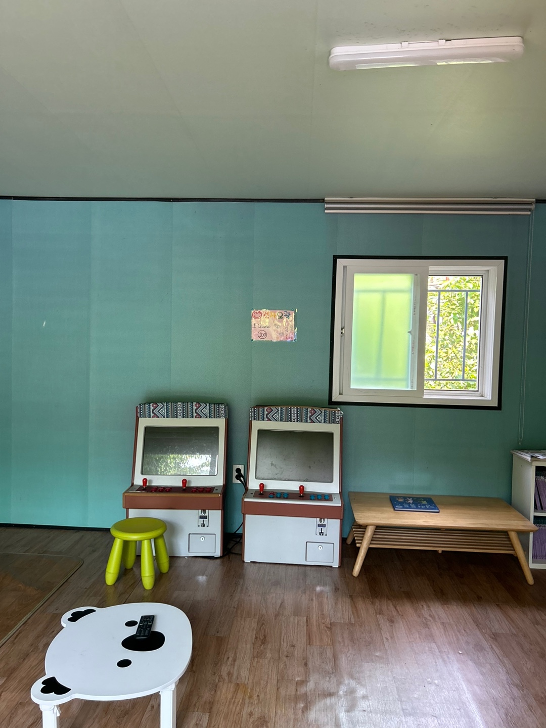 수영장 쪽에 보면 미닫이 문으로 된 작은 방이 하나 있어요. 문을 열면 이렇게 작은 휴게 공간이 있어요. 오락기는 작동을 하는 것 같아 보이진 않았지만, 어린 아이들을 위해 책을 읽어줄 수있는 공간이더라고요.